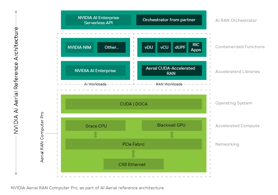在美国运营商T-Mobile与英伟达近期的AI-RAN合作演示中,英伟达提供的AI-RAN产品组合包括英伟达ARC-Pro——基于英伟达RTX PRO 4500 Blackwell服务器构建——用于蜂窝站点,以及英伟达RTX PRO 6000 Blackwell服务器,用于更高容量的移动交换局。此次合作展示了下一代AI-RAN基础设施如何将无线网络转为分布式高性能边缘AI计算平台。