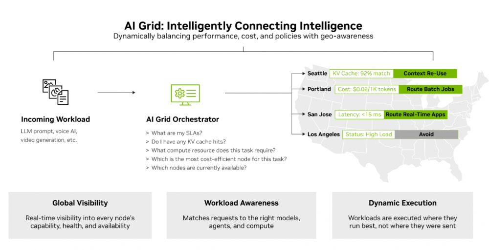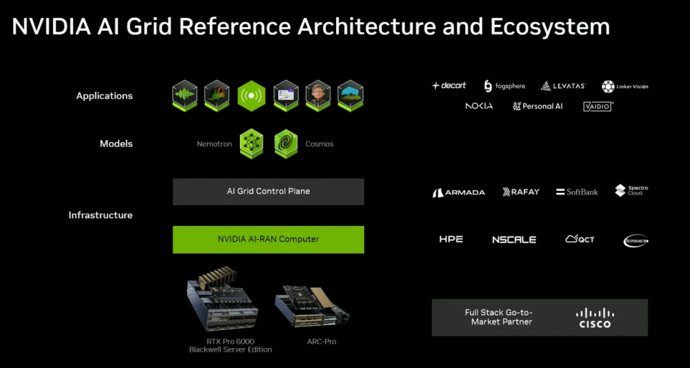 英伟达在3月召开的GTC大会上提出了“AI Grid”愿景,其核心思想是利用电信运营商、云服务提供商等现有的广泛网络覆盖,将AI计算能力(特别是推理能力)部署在更靠近最终用户和设备的地方,从而支持AI原生应用的大规模、低延迟扩展。
