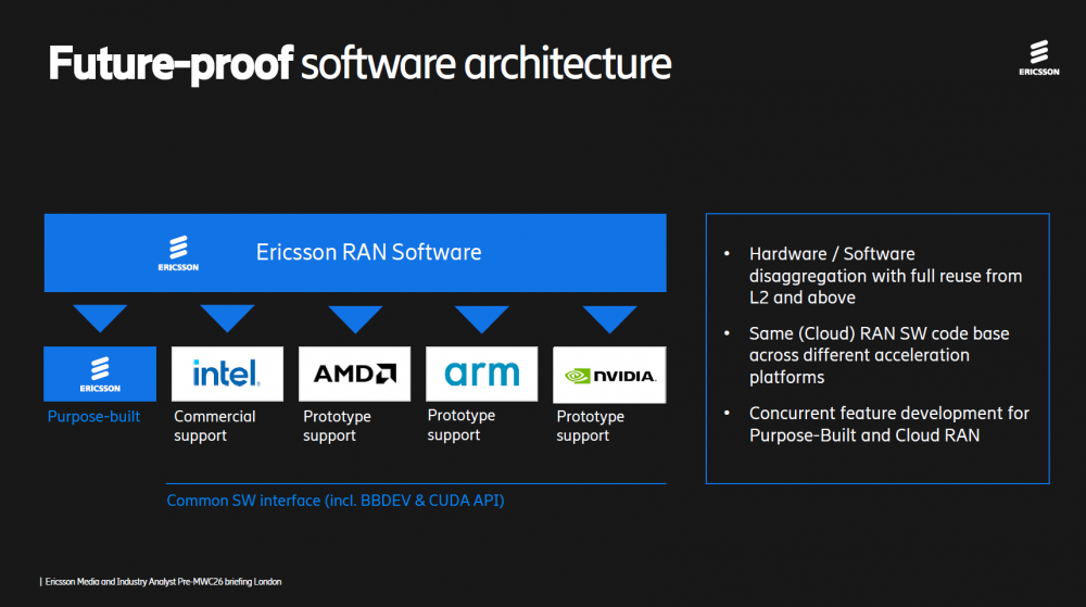 同时,爱立信希望通过其“可移植的RAN软件”实现“硬件平台无关”的全面软件兼容性——爱立信表示已在Layer 2及以上层面实现软硬件解耦。MWC26上,爱立信与T-Mobile合作,基于英伟达AI基础设施,借助NVIDIA Aerial CUDA成功完成了Cloud RAN软件的演示,此次测试验证了爱立信Cloud RAN软件的可移植性。