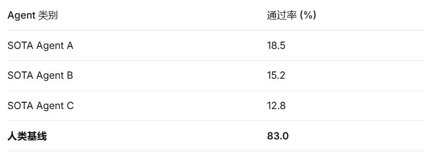 结果令人警醒:即使是最先进的Agent,通过率也低于20%。更值得玩味的是失败模式:大部分任务在完成度不到30%的阶段就已停滞,关键失败往往发生在早期阶段。