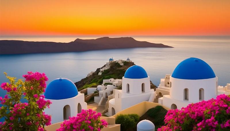 prompt: Santorini white buildings with blue domes overlooking the Aegean sea at sunset. Warm golden light, bougainvillea flowers, calm ocean, iconic Greek island view.