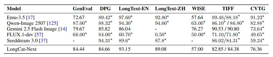 传统的观点认为,理解和生成是两个相互竞争的目标 。但在 LongCat-Next 中,它们被统一为同一自回归预测过程中的两种表现形式。实验证明,将视觉理解与生成置于统一的自回归目标下进行联合训练,两者并未产生容量冲突。