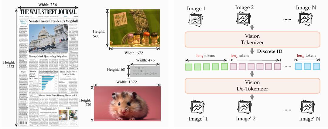 dNaViT 原生分辨率:传统视觉模型通常依赖固定分辨率输入,这在缩放或裁剪过程中不可避免地带来信息损失。dNaViT 则直接在原生分辨率下处理任意长宽比图像,将视觉信号转化为变长 token 序列,从而最大程度保留细节信息。