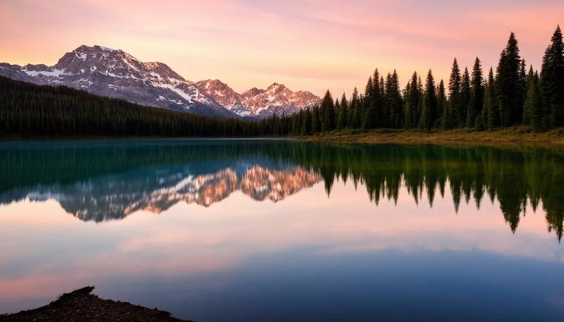 prompt: A crystal clear mountain lake reflecting snow-capped peaks at sunrise. Still water, mirror-like reflection, pink and gold sky, pine trees along the shore.