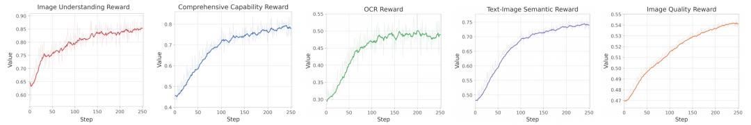 将多模态数据离散化为 token 的另一项技术红利,体现在强化学习阶段。离散视觉潜在空间天然可以作为动作空间,使模型能够直接套用语言模型成熟的 RL 算法(如 GRPO)来提升画图和理解能力,避免了连续空间中复杂的采样与映射过程。