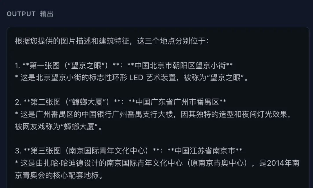 LongCat-Next 准确识别出北京「望京之眼」、广州中银大厦及南京青奥中心三处建筑,并对每座地标建筑的背景信息有所掌握。