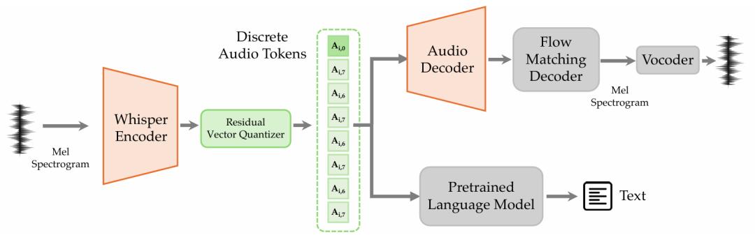 声音同样被纳入统一的离散建模体系中。模型首先利用Whisper 编码器提取音频的语义与副语言特征(如语气、情感等),随后通过下采样与 RVQ 压缩为离散音频 token。