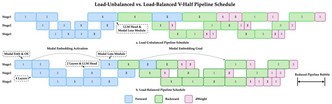 为解决这一系统瓶颈,团队采用了基于V-Half的流水线调度策略 。该策略通过「V 型调度」,将计算流水线的第一个阶段(Embedding 层)和最后一个阶段(模态特定的损失模块)「折叠」并共置于同一个物理设备上 。