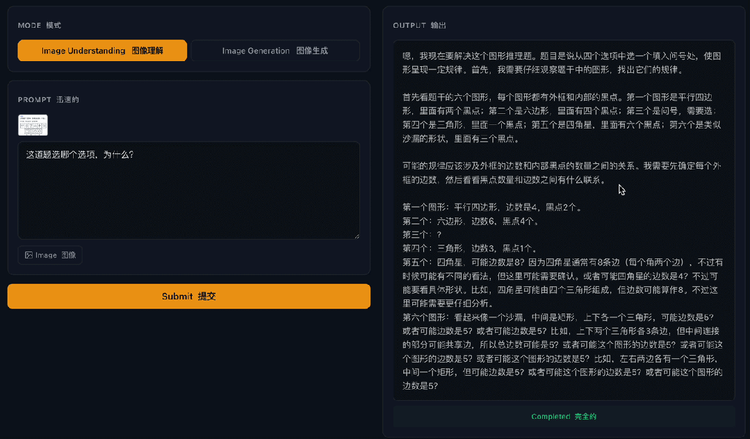 比如用四川话问它一道经典逻辑谜题,LongCat-Next 没有出现识别偏差或语义丢失,四川话的语音信号被准确转化为可推理的语义内容,并顺畅进入后续逻辑分析流程。