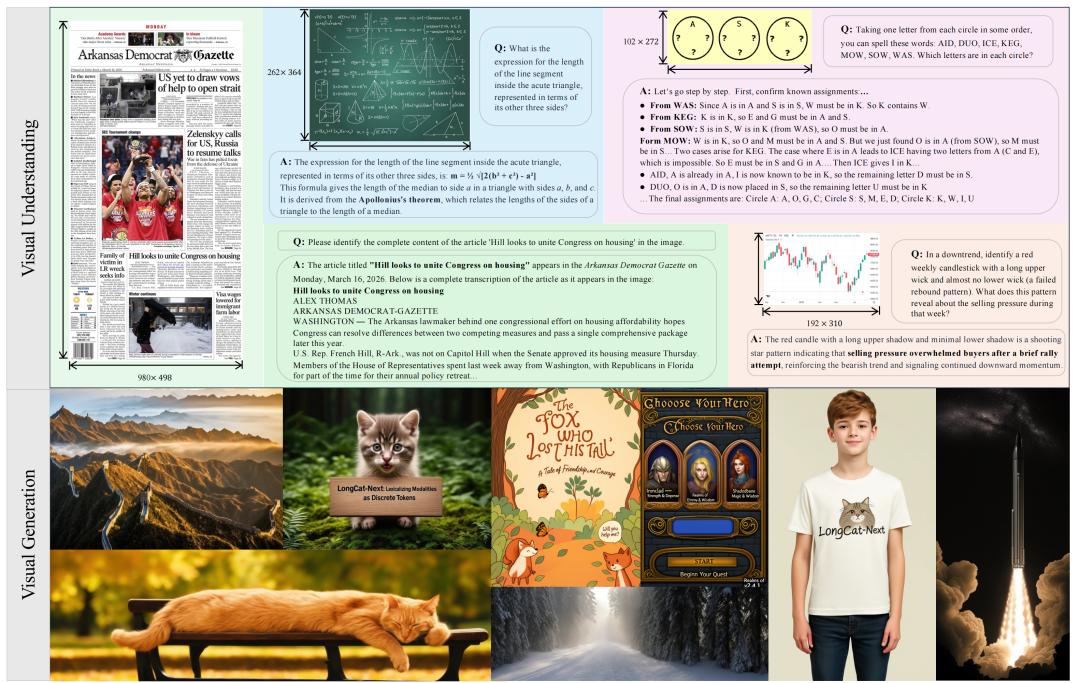 LongCat-Next 在复杂视觉理解任务中的表现。即使面对排版密集的报纸、复杂的几何图表与逻辑推理题,转化为离散 token 后的模型依然能够精准提取信息并进行深度逻辑推理,证明了该离散表示的语义完备性。