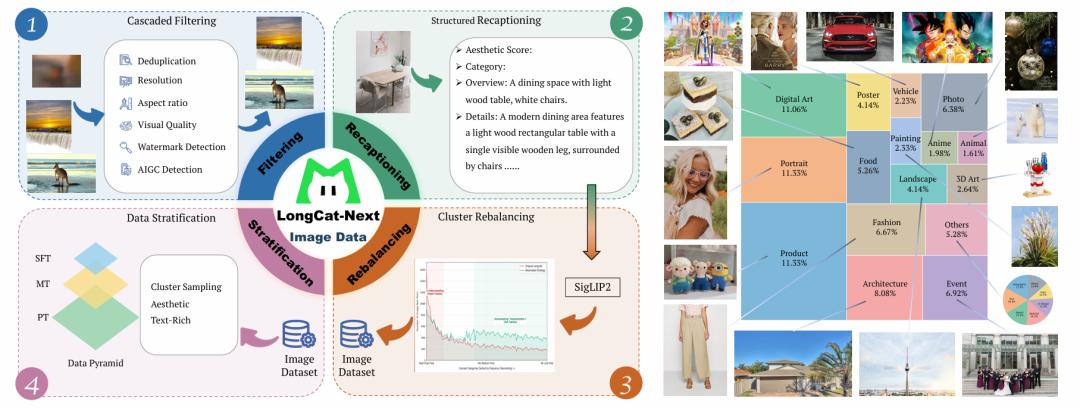 左图: 数据整理与训练流程包含三个阶段:(I)预训练:通过过滤和重新描述实现基本对齐;(II)中期训练:通过语义聚类和重平衡解决数据不平衡问题;(III)监督微调:基于高质量、遵循指令的数据,提升美学质量和文本渲染效果。右图: 图像来源的分布情况。