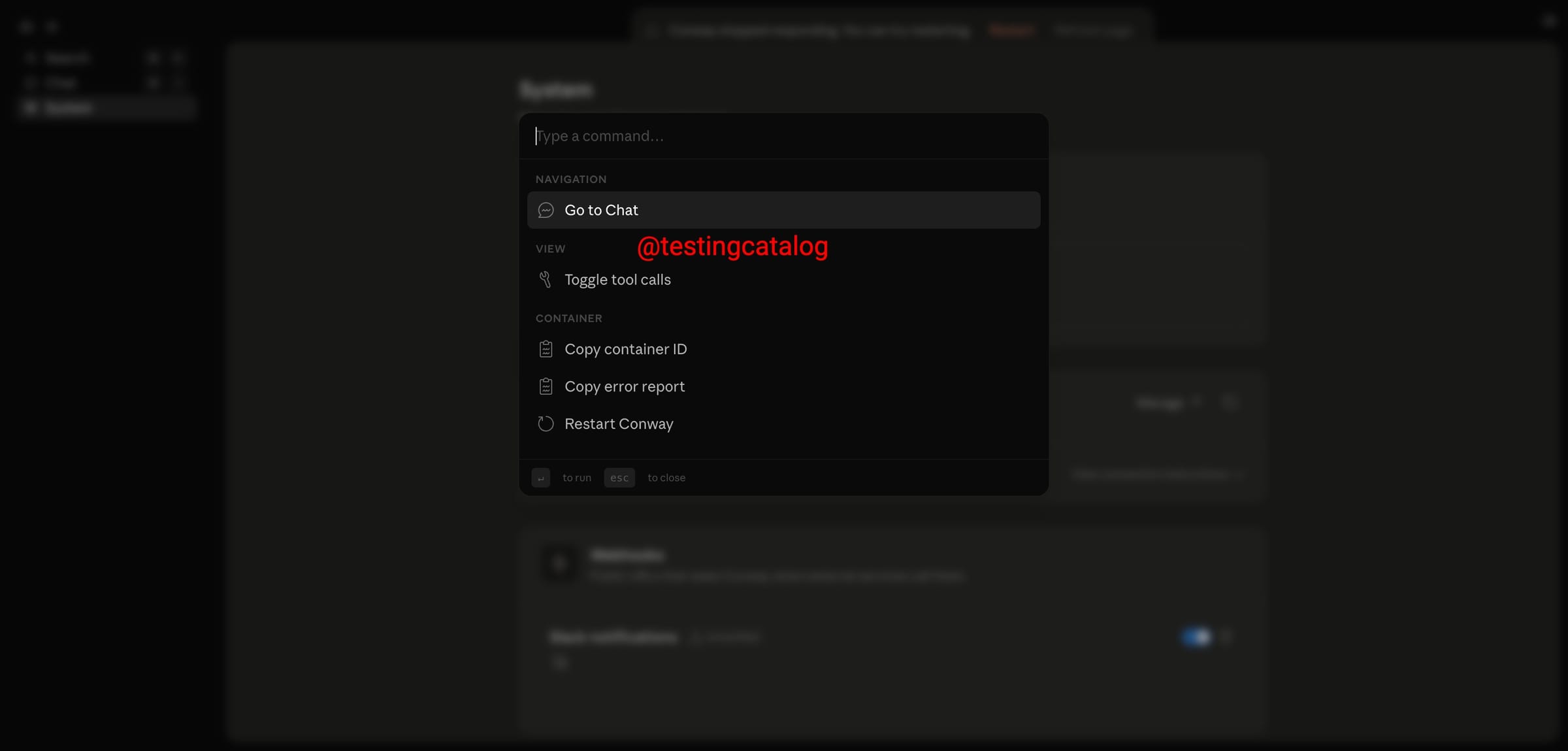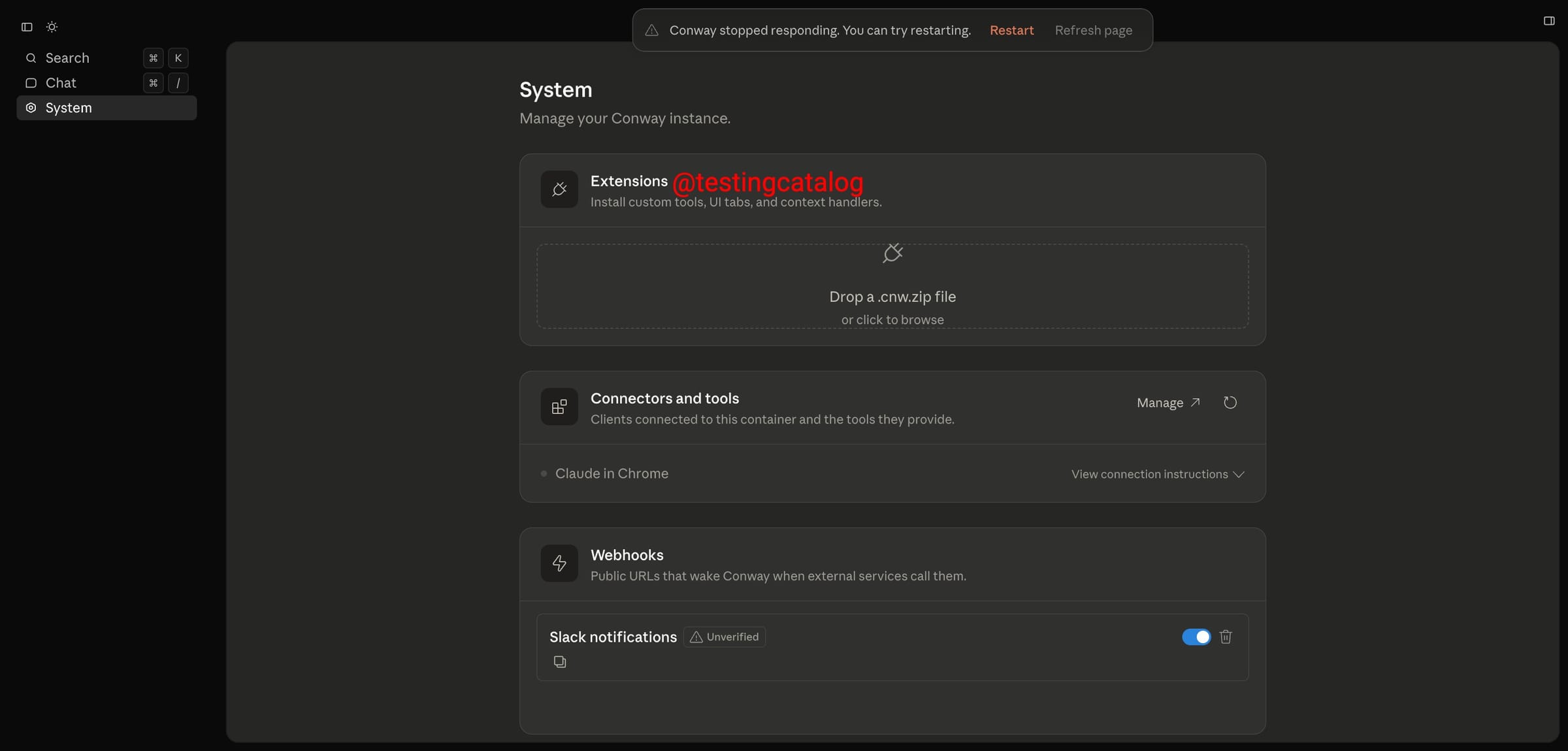 Conway 拥有独立的操作面板,侧边栏划分为搜索、对话与系统三大核心模块。搜索功能目前绑定了实验性快捷键,对话模块负责日常交互,而系统模块则隐藏着该实例的核心底层架构与管理权限。