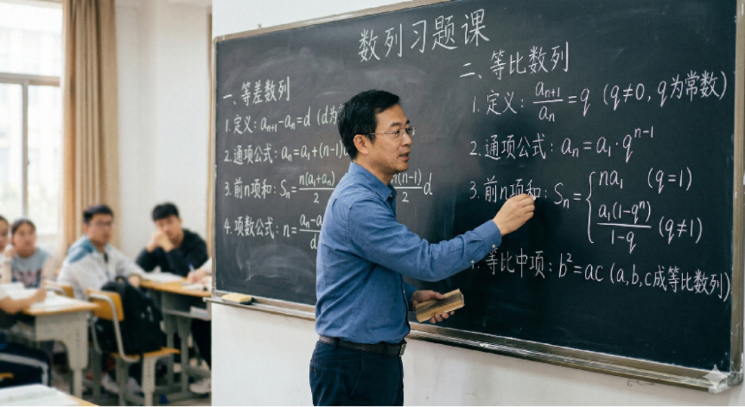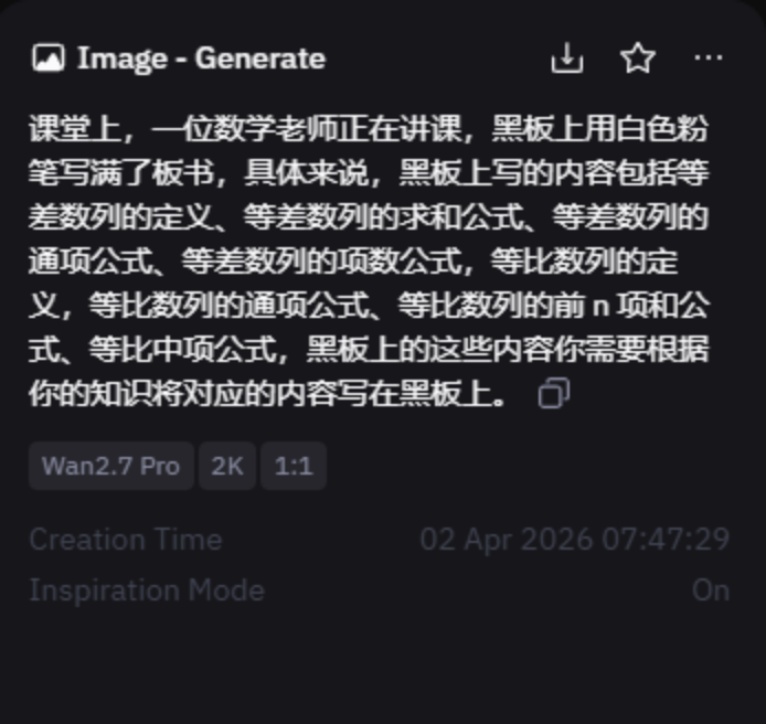 接着小编又提升了测试难度,加入了复杂的数理公式、不同语言的文字。具体来说,小编让 Wan2.7-image 生成数学老师上课的黑板板书,板书上分别是等差数列、等比数列的定义和三个基本公式。在提示词中,小编没有将这些具体的内容写出来,而是让 Wan2.7-image 根据自己掌握的知识来生成。