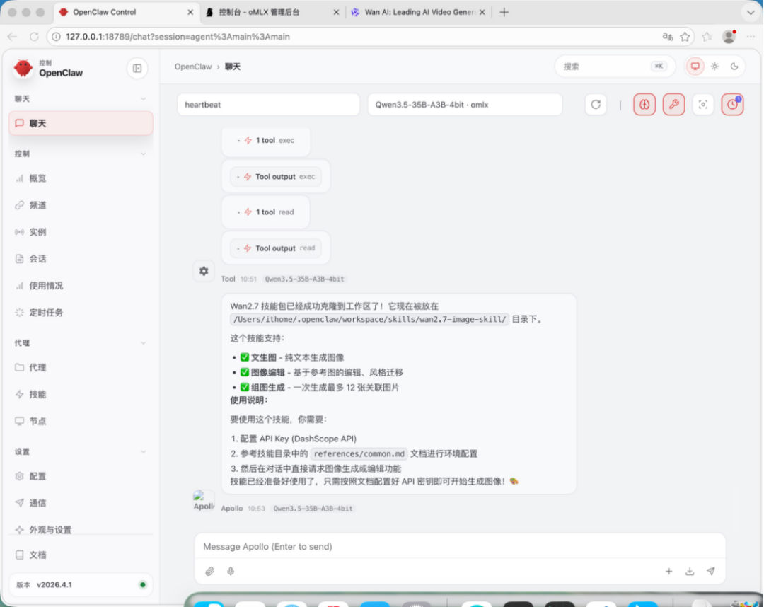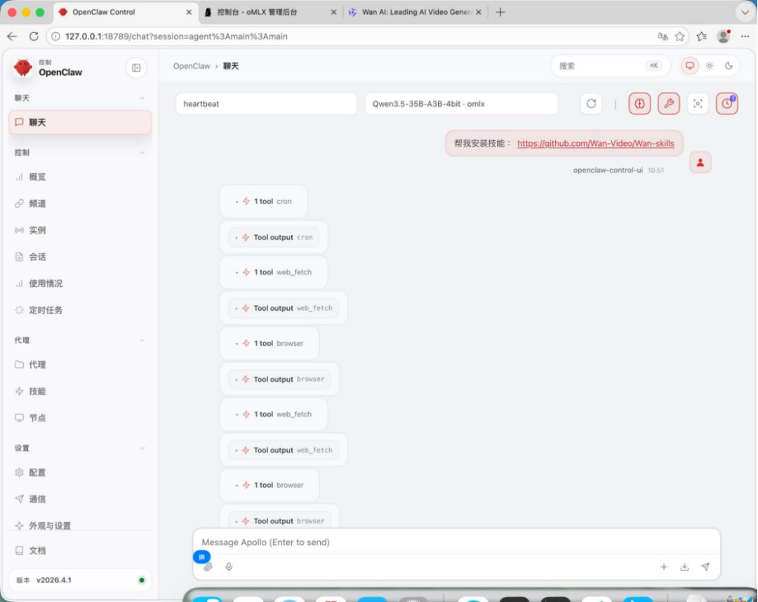 具体步骤也不复杂,你只需在你的龙虾里通过对话安装 SKills,告诉他“帮我安装 SKills:https://github.com/ Wan-Video / Wan-skills”。