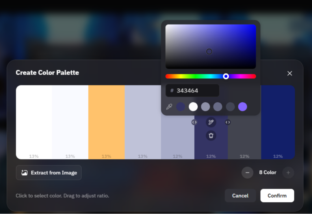 除了推荐的色彩,你也可以自己在调色盘里调整这 8 种色彩,比如小编自己调了一套色彩,调色的时候,你可以选择颜色的色号、色彩占比。