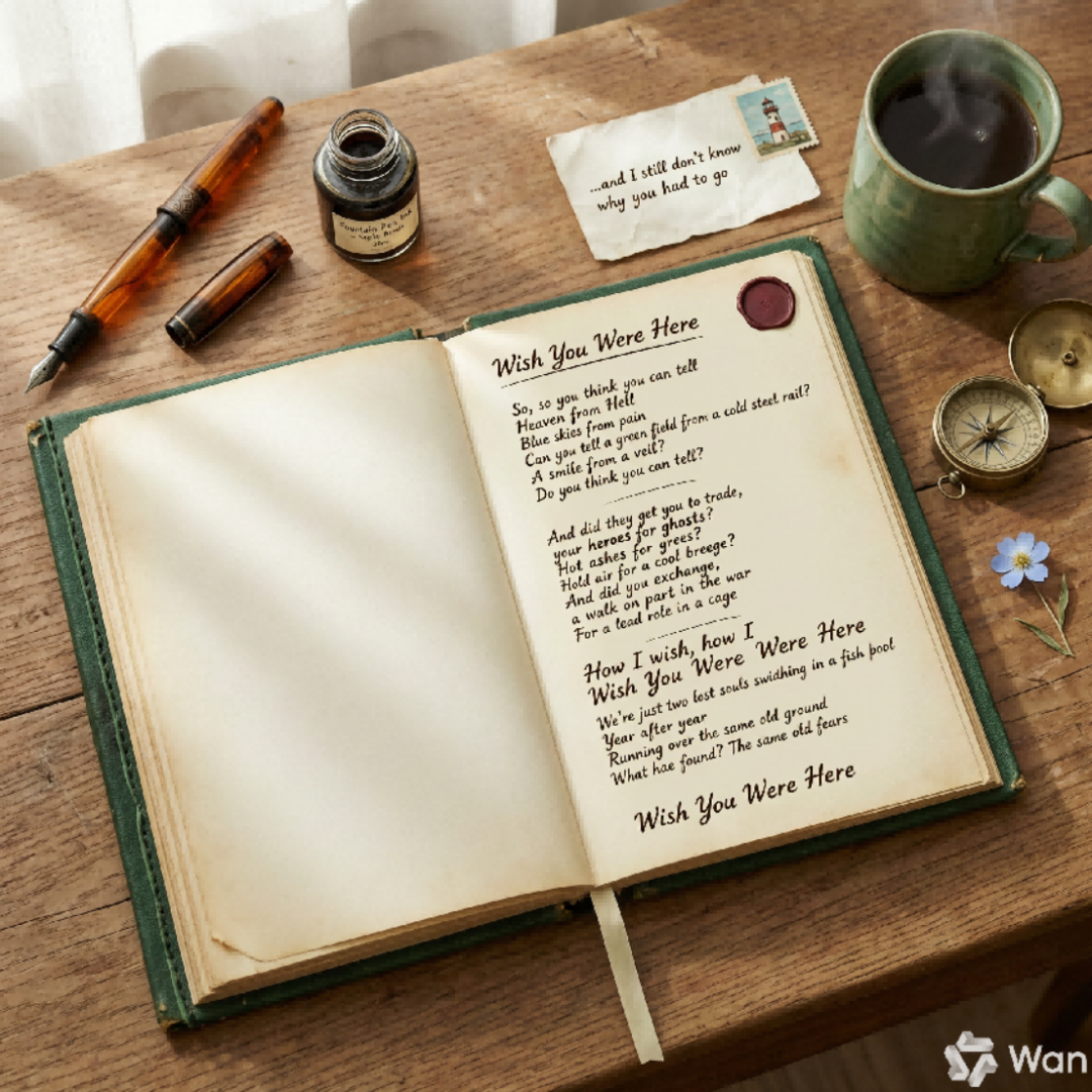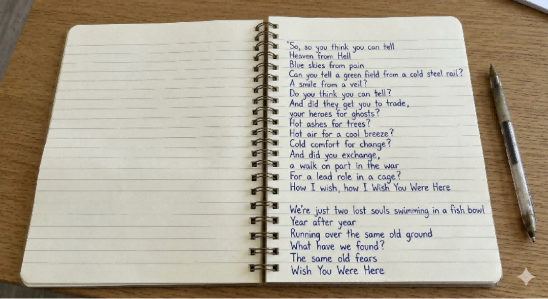 测试时,小编让 Wan2.7-image 生成一张“书桌上一个笔记本上写着《Wish You Were Here》歌词的原文”的图片,重点看笔记本上歌词的原文,Wan2.7-image 生成的图片中,笔记本上的歌词没有错误,并且还有合理的排版。