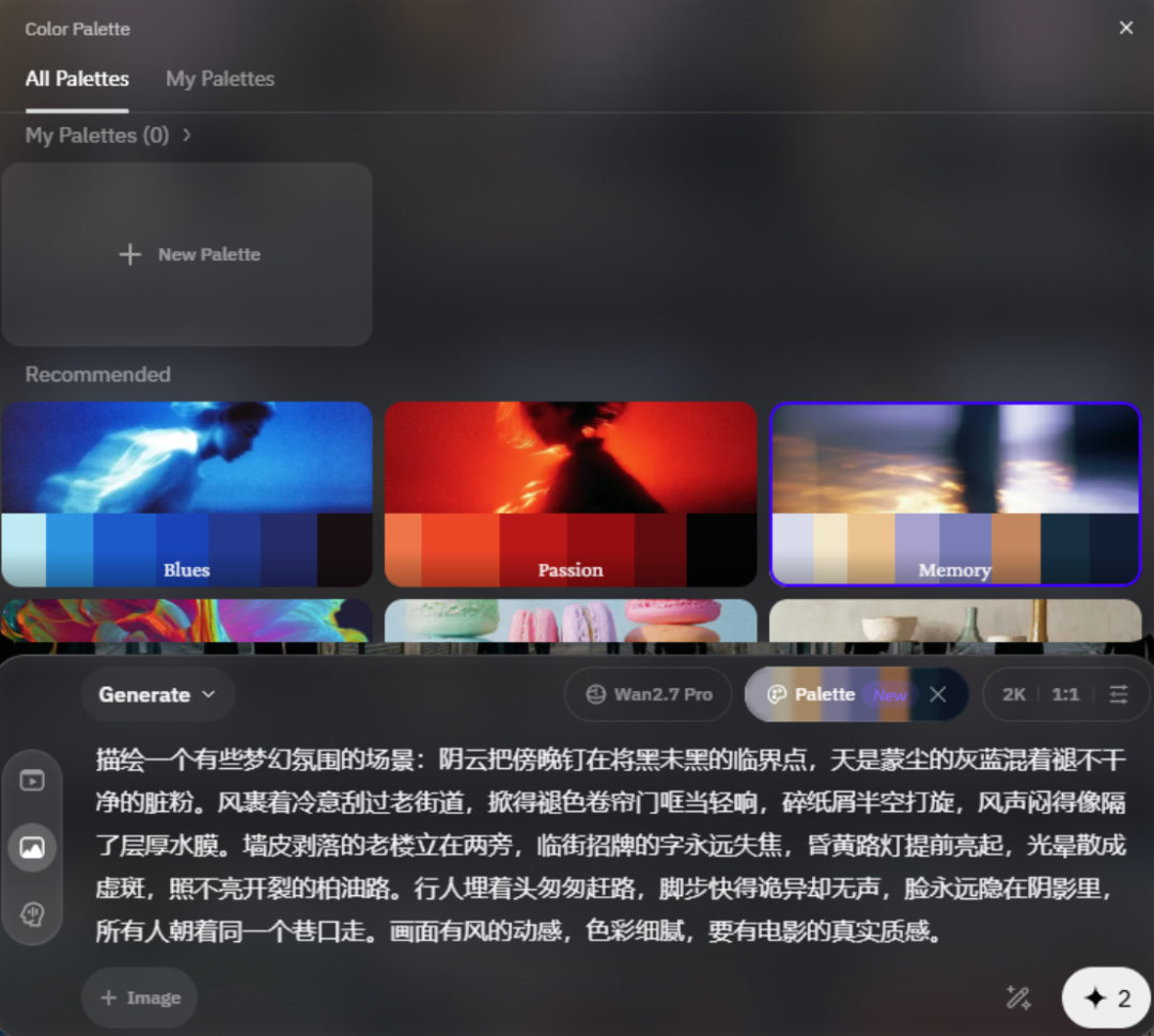 在实际使用过程中,如果你想要你的照片有某些独特的色彩艺术质感,就可以点击对话框右上方的“调色盘”功能,点开后,你就可以指定你想象中的颜色。Wan2.7-Image 默认给我们推荐了几种经典风格的色调,小编先从这些推荐的开始。