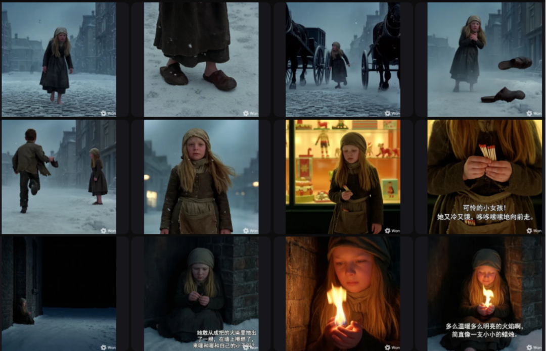 再看 Nano Banana Pro 生成的组图,整体表现也不错,不过在故事逻辑上存在一些问题,比如小女孩先是赤脚,然后才出现鞋子跑掉的画面,逻辑顺序反了,还有火柴竟然是擦墙点燃的,不符合逻辑。