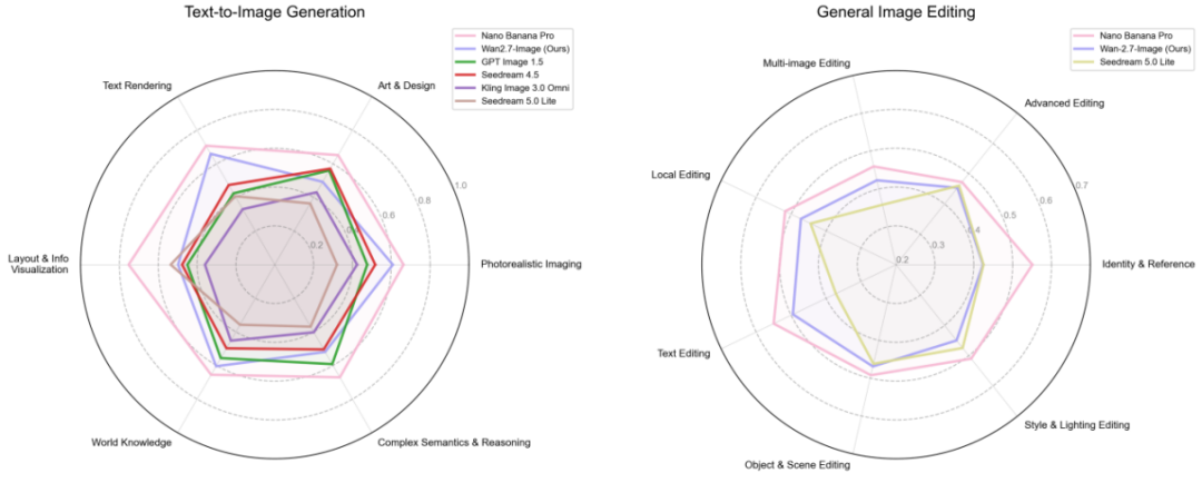 在权威的人类偏好盲测中,Wan2.7-Image 的文生图能力已经超过了 GPT-Image1.5 与国内主流模型,在文本渲染、照片级成像、世界知识三大核心指标上,已经无限接近 Nano Banana Pro,同时整体的人类偏好盲测评分位列国内第一。