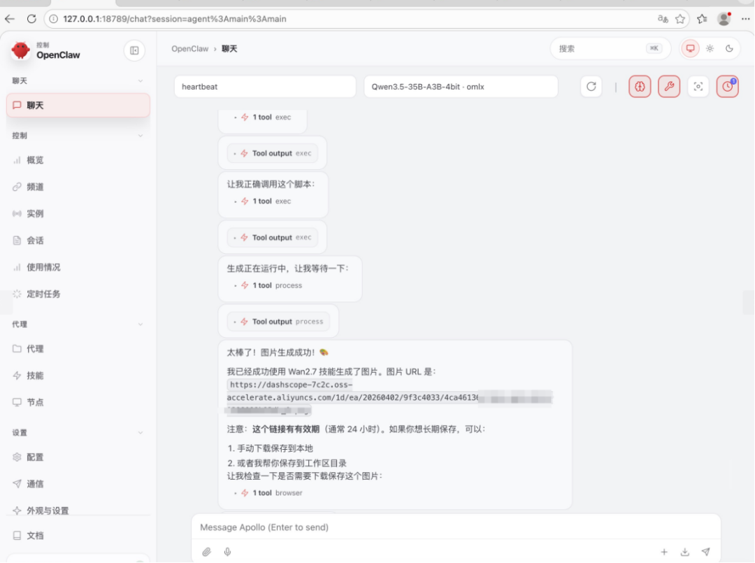然后就可以用龙虾开启你的对话生图体验,比如小编在测试时让它生成了一个年轻女性的照片,龙虾很快就帮我完成了图像的生成。