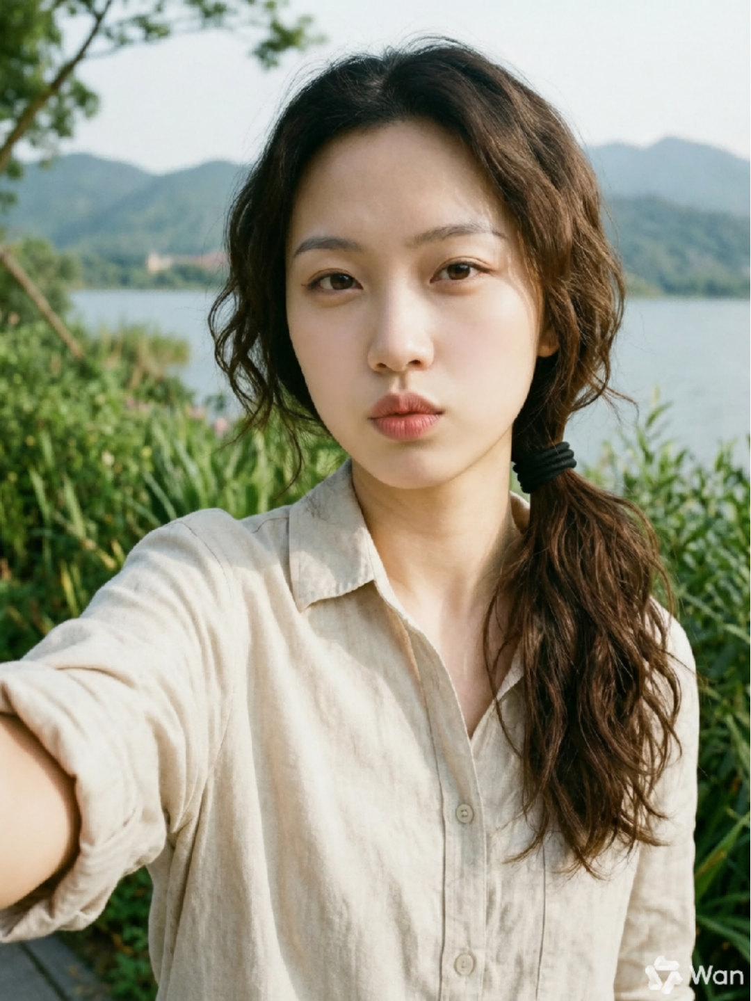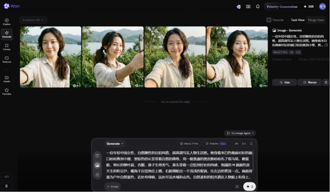我们先尝试了基础定制需求,让它帮我生成一个中国女性生活照,其中对五官的要求比较细致,包括“鹅蛋脸”、“柳叶眉”、“带点肉感的秀鼻”“M 唇”、“梨涡”等特征。Wan2.7-Image 一次生成 4 张。