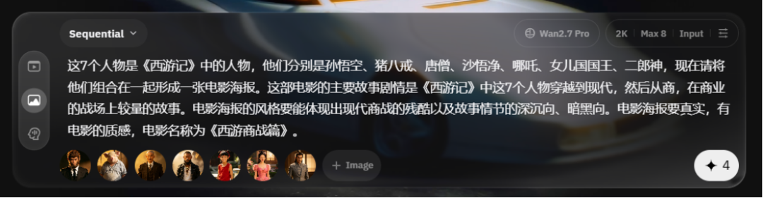 比如测试时小编找来 7 张西游记中的人物穿着现代衣服的照片让它作为参考图,然后让 Wan2.7-Image 以这 7 个人物为主体设计一张《西游商战篇》的电影海报。