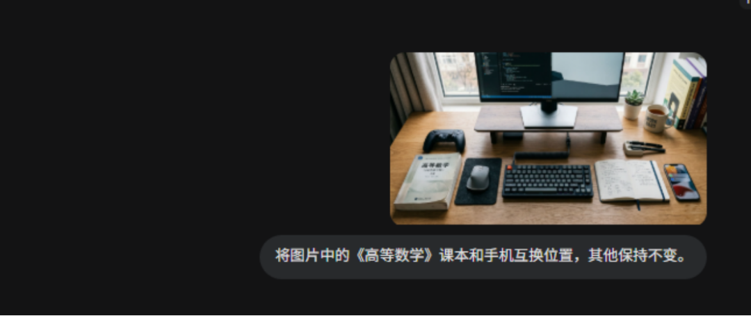 而 Banana Pro 这边,只能通过提示词指定明确的途中物品元素然后进行修改,改过后,虽然手机和课本的位置互换了,但课本挡住了笔记本,也算是对画面其他元素产生的修改。