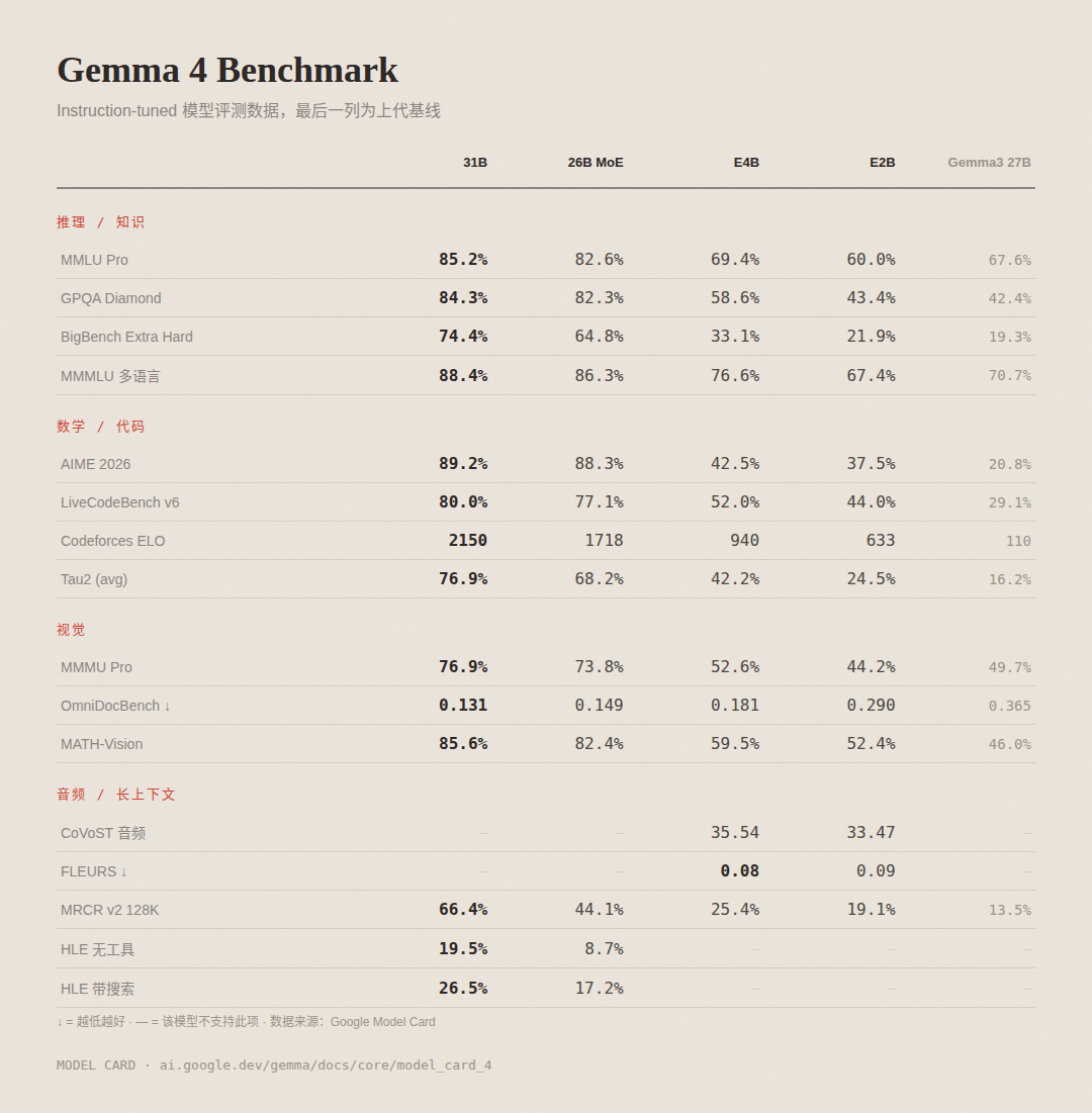 Gemma 4 完整 Benchmark 数据,最后一列为 Gemma 3 27B 基线
