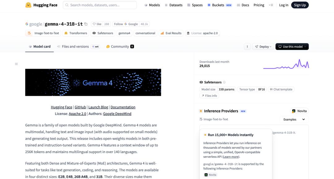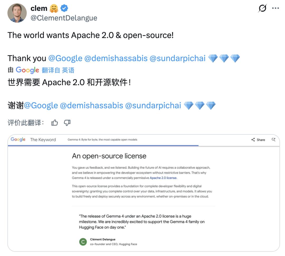 Hugging Face 联合创始人兼 CEO Clément Delangue 将此次授权切换称为「一个重要的里程碑」。自 2024 年 2 月首代发布至今,Gemma 系列总下载量已超 4 亿次,社区衍生变体超过 10 万个。