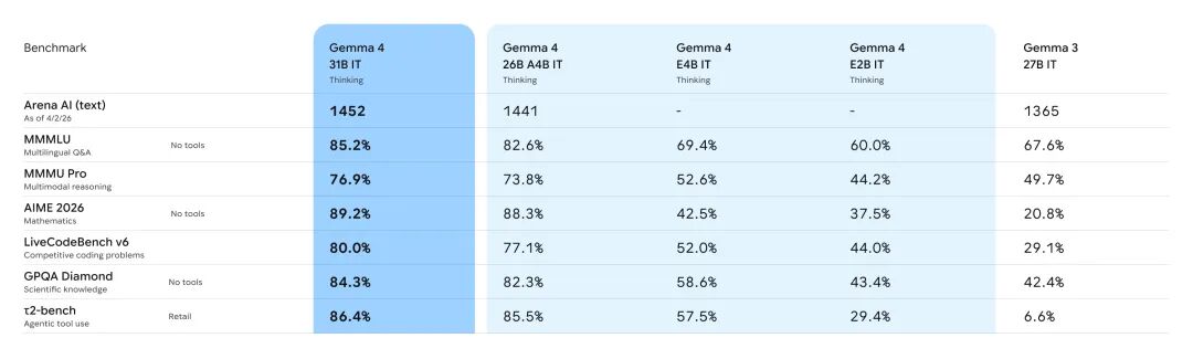 基准测试的数字,能更直观地说明这一代的升级幅度。与上一代 Gemma 3 27B 相比,Gemma 4 31B 在数学推理基准 AIME 2026 上从 20.8% 跳升至 89.2%,代码能力基准 LiveCodeBench v6 从 29.1% 升至 80.0%,衡量 Agent 工具调用能力的 τ2-bench 则从 6.6% 大幅提升至 86.4%。