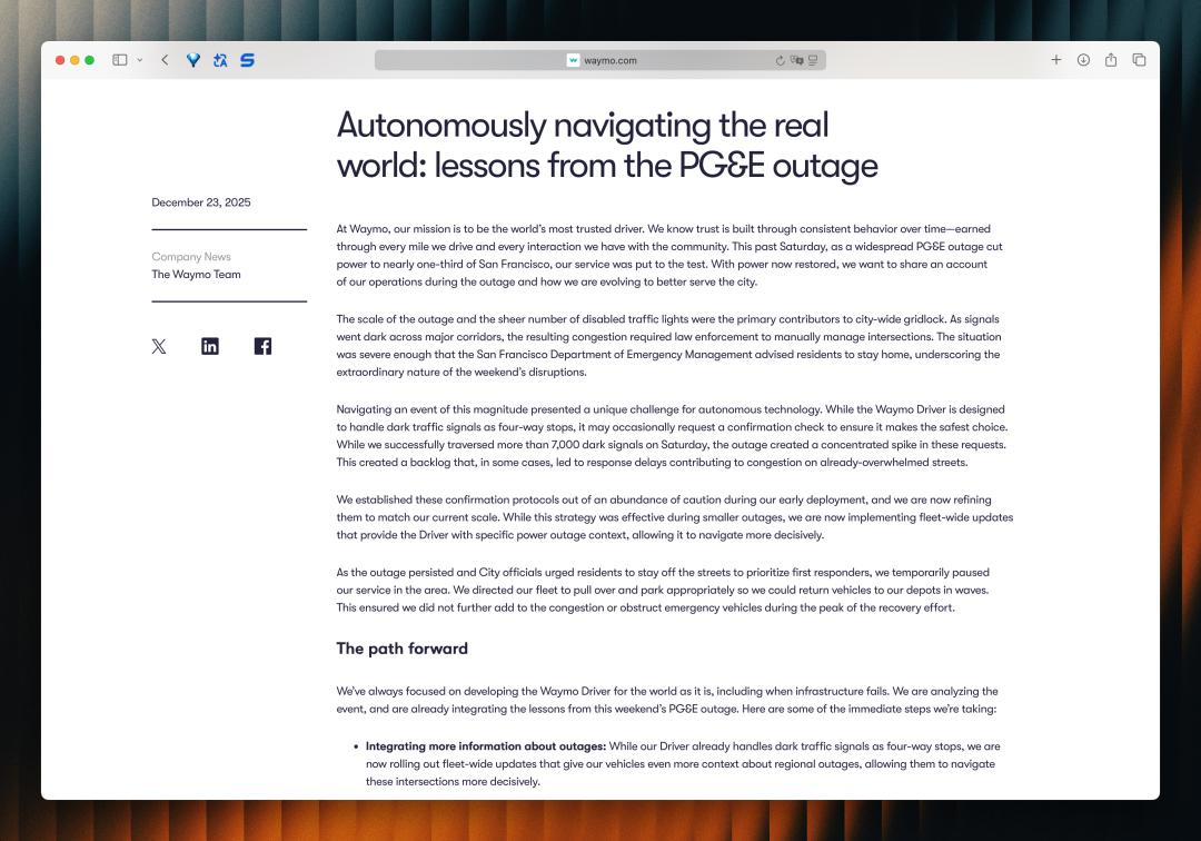 Waymo 对外回应称,其系统预设将失效信号灯视为“四向停车”(Four-way stop)场景,但因停电规模超预期,车辆确认路口安全状态耗时过长,最终触发最小风险状态。