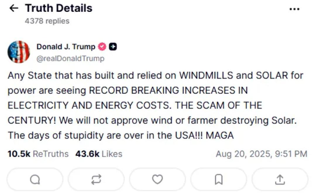 特朗普炮轰可再生能源是“世纪骗局”图源 | Truth Social