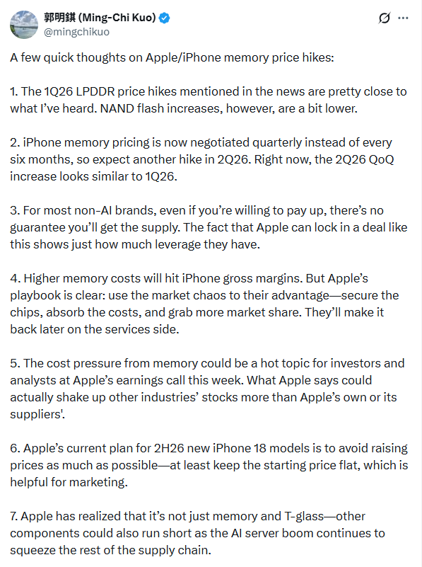 这一猜测与今年1月知名分析师郭明錤的想法几乎一致。当时,郭明錤就曾认为,内存涨价会影响苹果的毛利率,但吸收成本将有助于占领更大市场份额,且苹果可以通过服务来弥补损失。