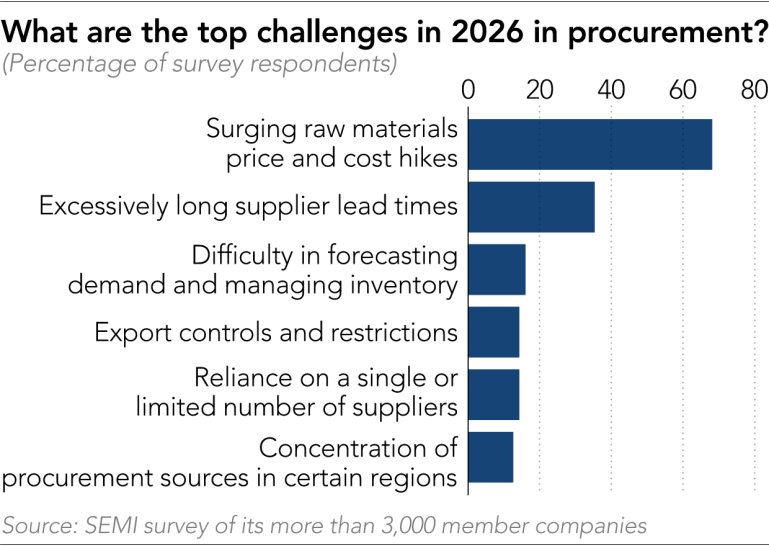 根据全球领先半导体行业协会 SEMI 进行的一项调查,近 70% 的会员公司将采购成本上升(由原材料价格飙升)视为今年的主要挑战。