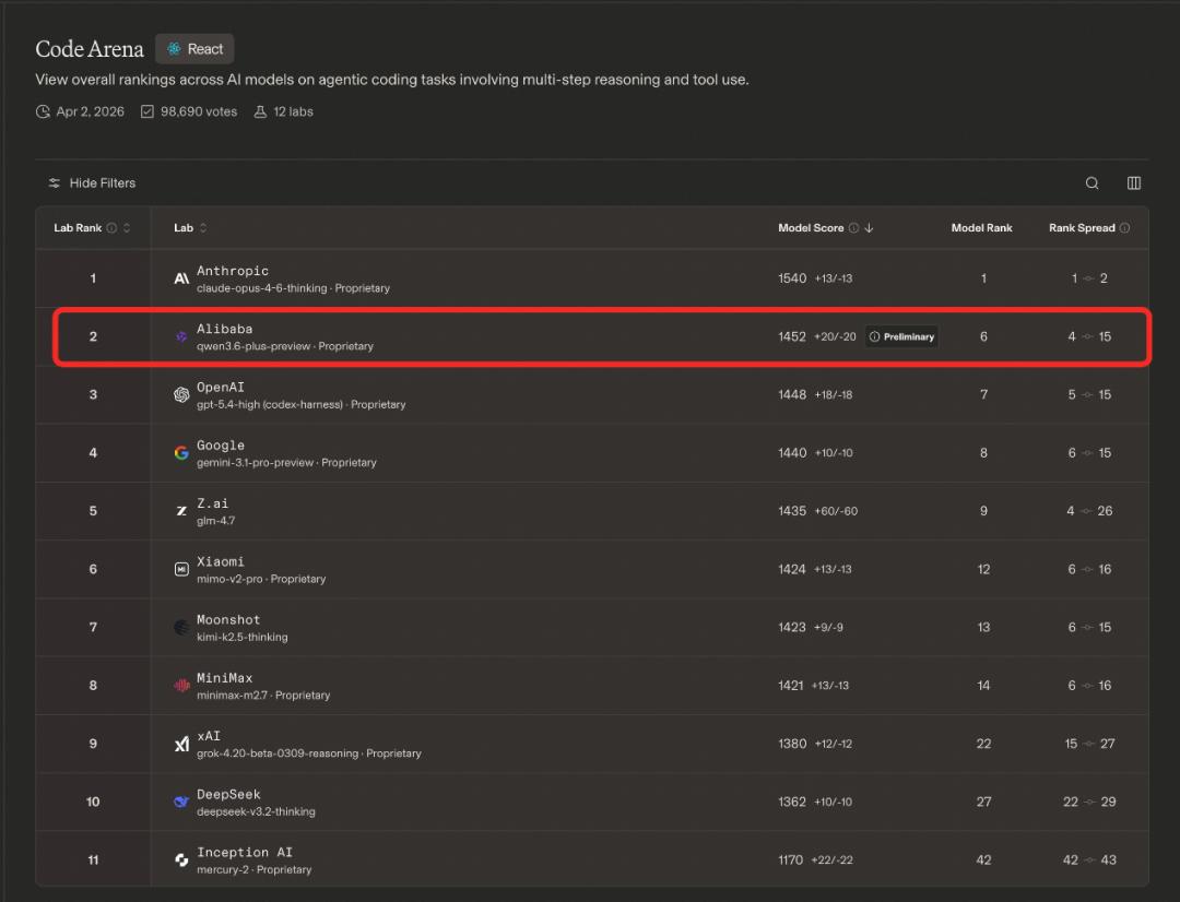 而在最新一期全球知名大模型盲测榜单LMArena旗下聚焦AI编程能力的Code Arena榜单中,阿里更是凭借Qwen 3.6-Plus摘得全球第二,超越OpenAI、Google、xAI等国际巨头,成为该榜单上排名最高的中国大模型。