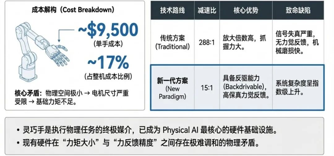 灵巧手之所以难,在于一个根本性矛盾:手指空间太小,放不下大电机;小电机力矩不够,就需要高减速比齿轮箱来放大力量;而高减速比齿轮箱会带来惯性失真、力反馈丧失和机械磨损——这三个问题会从物理层面“毒化”AI 的学习过程。