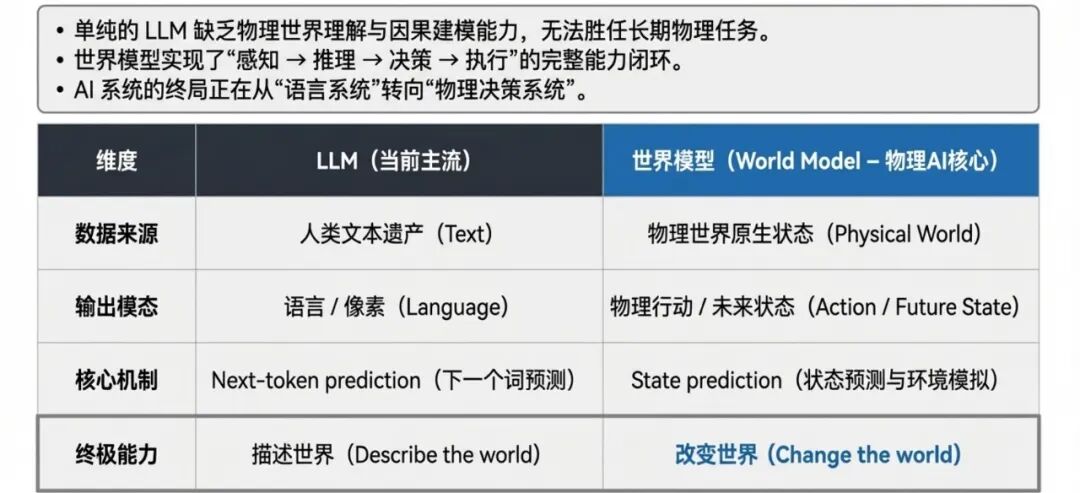 因此,以 Yann LeCun 为代表的一派开始推动另一条路径:World Model(世界模型)——预测“状态”,而非“文本”。两者的核心差异在于,LLM 以文本为学习对象、以语言为输出形式,本质停留在“认知与表达”;而世界模型则以物理世界状态为建模对象,直接指向“感知—决策—执行”的能力闭环。