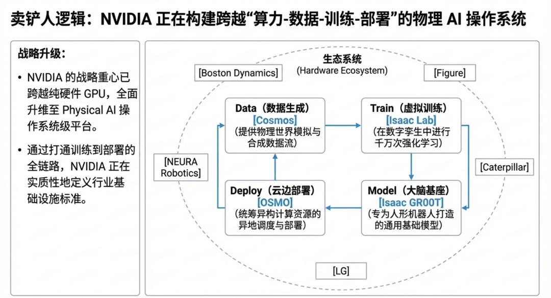 在大模型时代,NVIDIA 凭借 GPU 与 CUDA 生态成为最大受益者;而在 Physical AI 时代,其角色正在进一步升级——不只是提供算力,而是试图构建一整套机器人时代的基础设施。