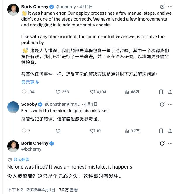 Claude Code 之父 Boris Cherny 也出面回应道:“这是人为错误”,并强调没有人因此被解雇,「这只是个无心之失,这种事时有发生。」