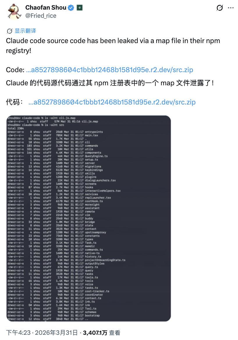 3 月 31 日凌晨 4 点 23 分,Chaofan Shou 在自己的 X 平台账号(@Fried_rice)上,简明扼要地发了一句话:「Claude Code 源代码通过其 npm 注册表中的一个 map 文件泄露了!」
