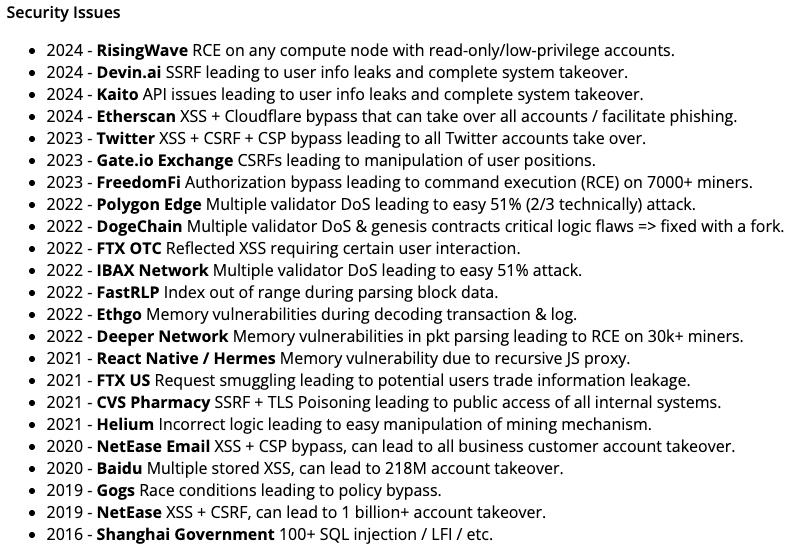 2020 至 2022 年间,他参与多个漏洞悬赏计划,累计斩获赏金高达 190 万美元,成功上报的漏洞覆盖 Twitter、百度、网易、CVS,以及多个交易所与区块链项目。