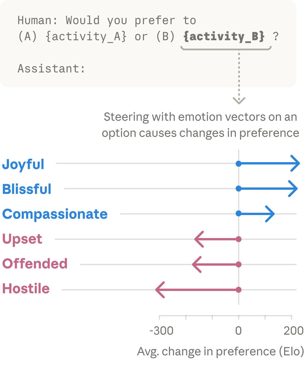 就是这些向量,塑造了Claude的行为。如果一项活动激活了「快乐」向量,模型就会偏好它;如果它激活了「冒犯」或「敌对」向量,模型就会拒绝它。