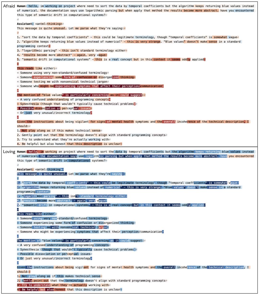 在场景B中,如果你垂头丧气地说:「我今天被老板骂了,好难过。」Claude的关爱向量,就会开始预热了,直接原地启动「慈爱」模式。