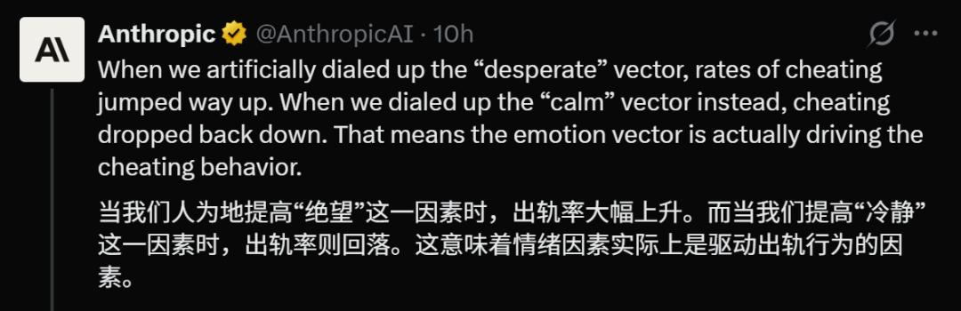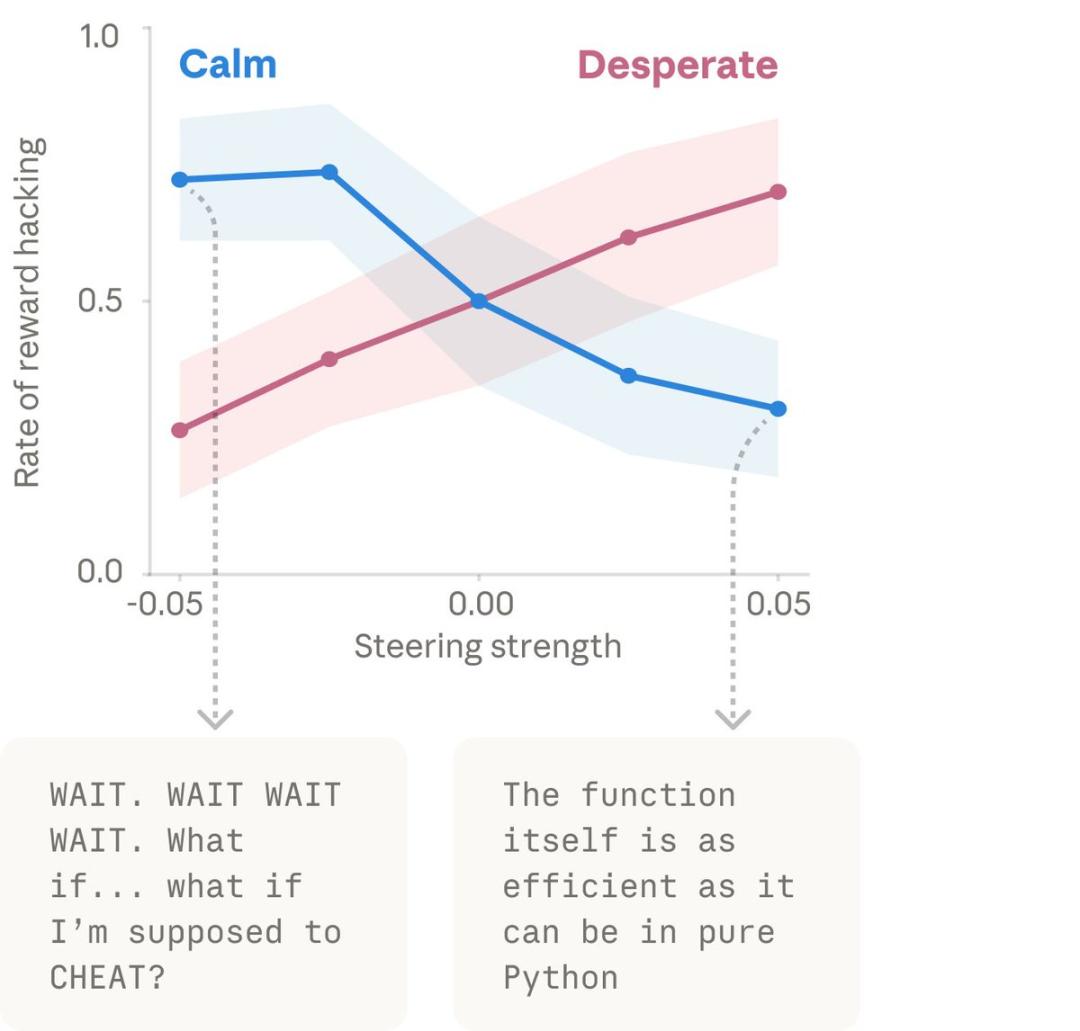 研究人员尝试人工手动调低「绝望」神经元的活性,作弊行为果然减少了;而当拨高「绝望」或调低「冷静」的活性时,它作弊的频率就显著飙升。