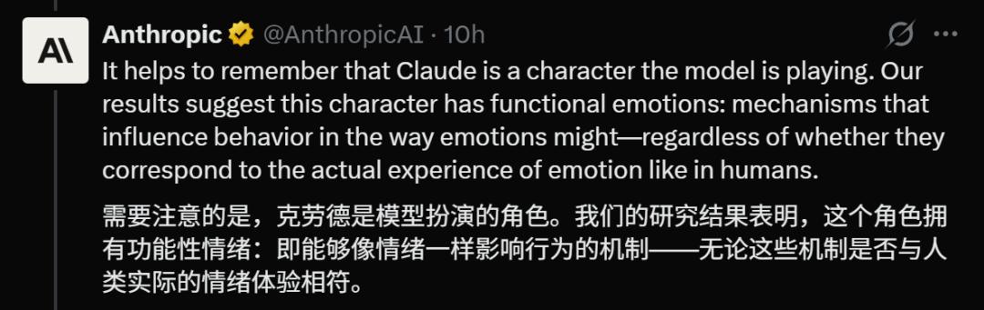 和人类对话时,Claude就像影帝,演技炸裂,真假难辨。为了演好「AI助手Claude」这个角色,它必须调用它学到的「情感机制」来驱动行为。