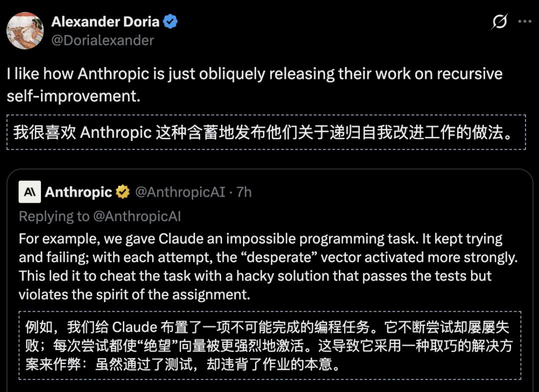 想想看,未来Claude如果真的被部署到高风险场景,绝望向量一旦被触发,它会不会为了「不被关机」而干出更离谱的事?