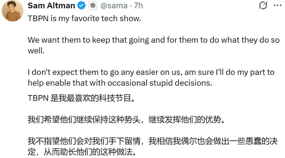今天,OpenAI联合创始人及首席执行官萨姆・阿尔特曼(Sam Altman)在X平台发文称:“我并不指望TBPN会对我们手下留情,而且我肯定会时不时做出些愚蠢的决定,给他们提供素材。”