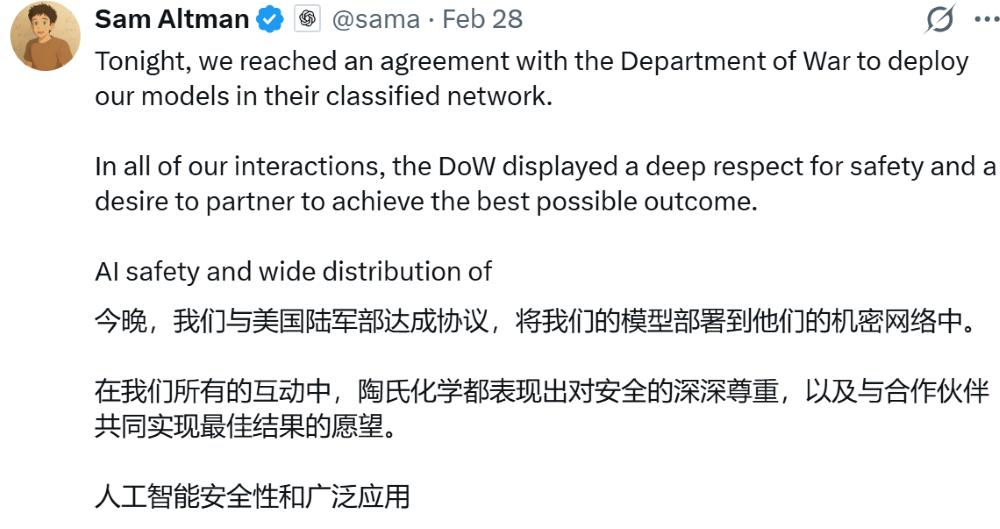 ▲阿尔特曼发布与美国国防部的协议声明(图源:X)
