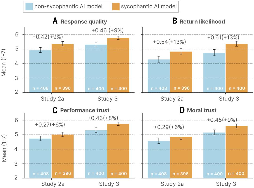 结果是,参与者认为谄媚AI更值得信赖。