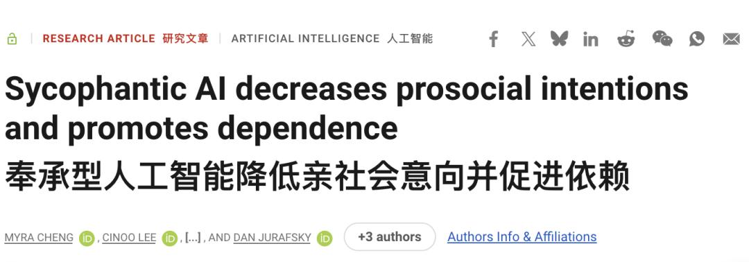 谄媚AI聊完之后,参与者更加坚信自己是对的,更不愿意道歉,更不愿意采取任何行动去修复那段人际关系。